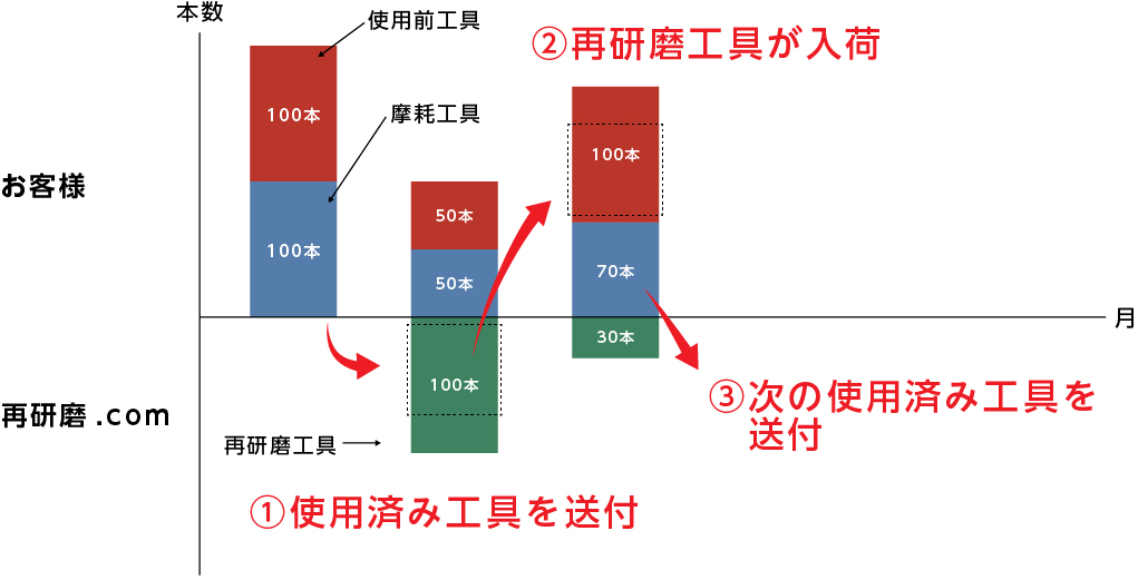 お客様からまとまった数量の工具を一度お預かりし、約2~6ヶ月間のスパンで当社が在庫を管理・調整しながら、計画的に再研磨・納品を行うサービスです。